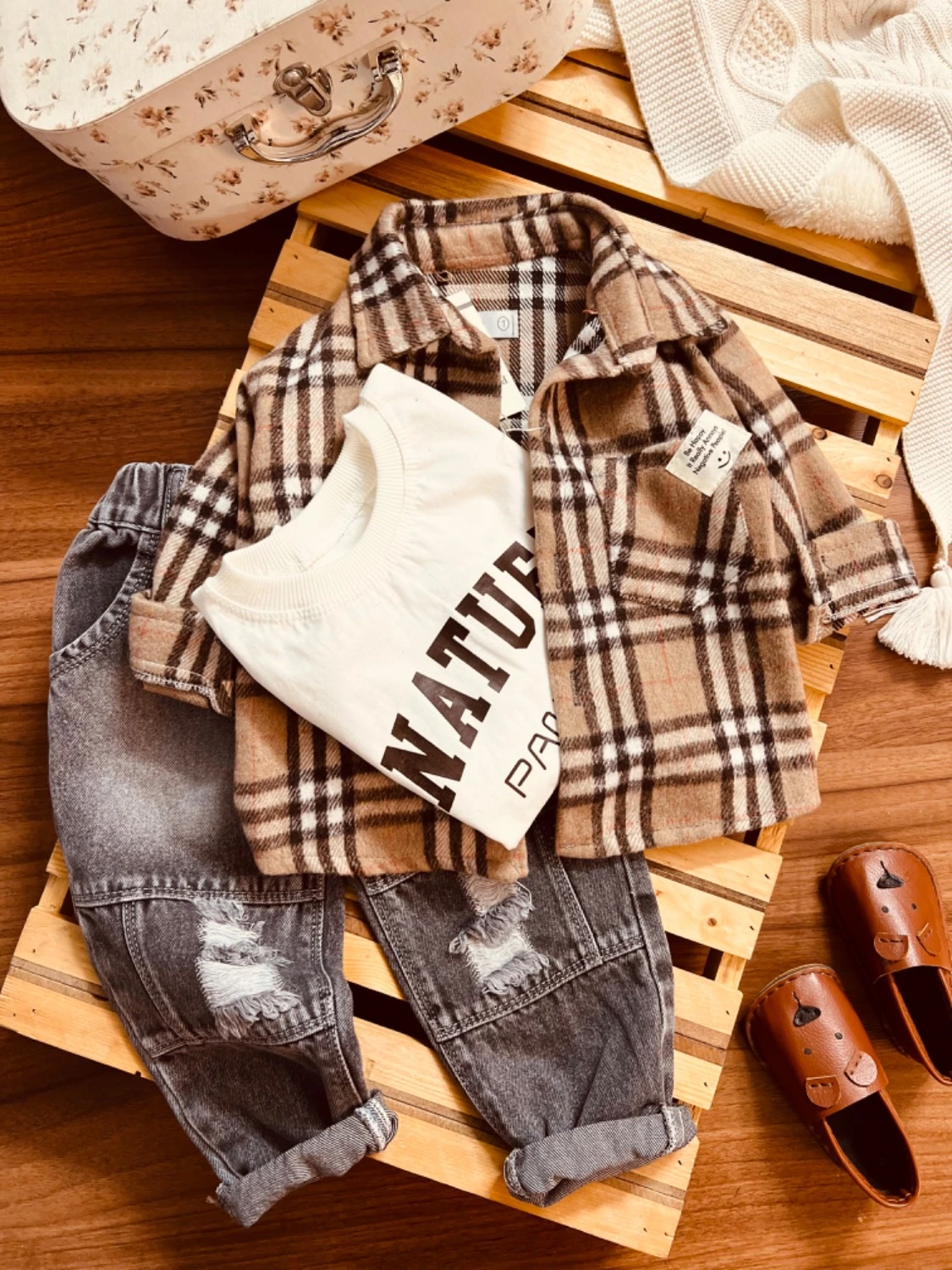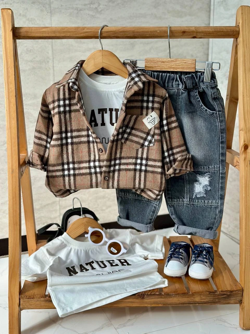 شلوار جین مام استایل | پیراهن موهر پشمی کشمیر | تیشرت نخ پنبه